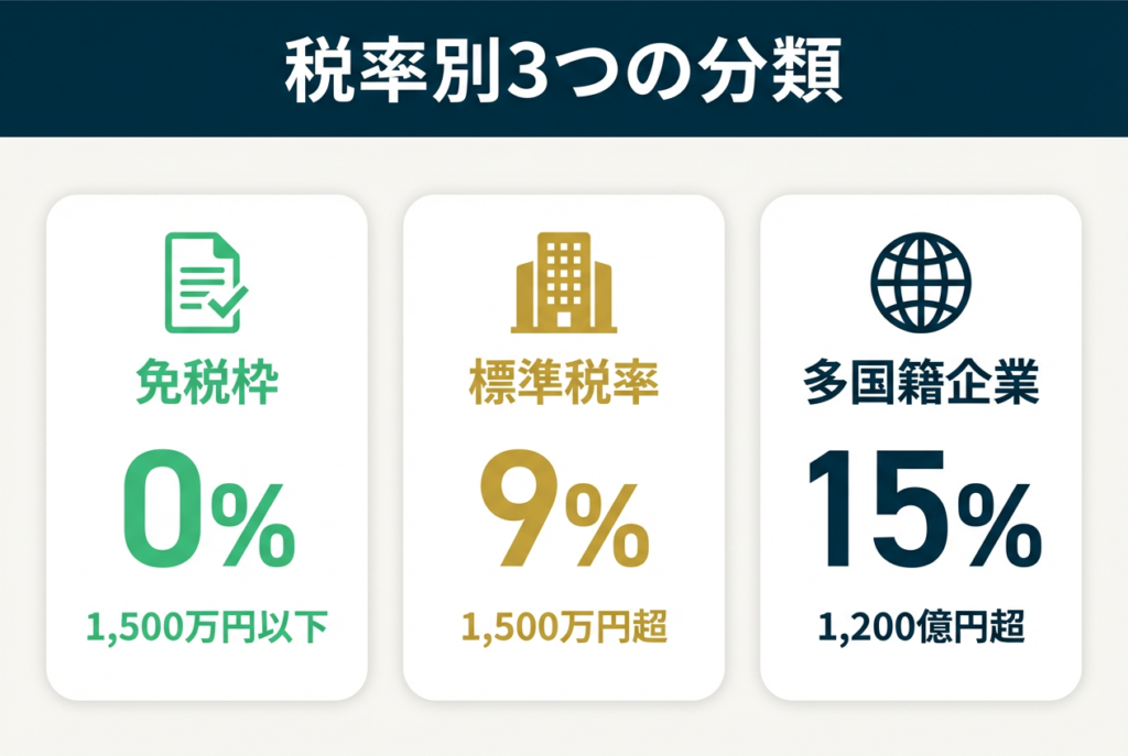 9%の法人税率は、年間課税所得が37.5万AED(約1,500万円)を超える部分に対して適用されます(*1)。この基準額以下の所得には0%が適用されるため、実質的に37.5万AED(約1,500万円)の非課税枠が全企業に設けられている構造です。