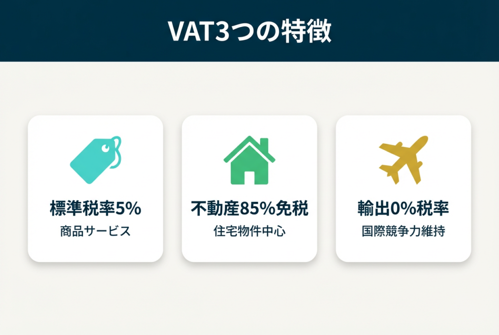 すべての取引がVAT対象ではありません。金融サービス(明示的手数料なし)、住宅用不動産(初回供給後)、更地、地域内旅客輸送などは免税取引とされ、VATが課されません(*18)。輸出取引は0%税率(ゼロレート)が適用され、VAT負担なしで輸出できますが、仕入VAT控除は認められます(*19)。