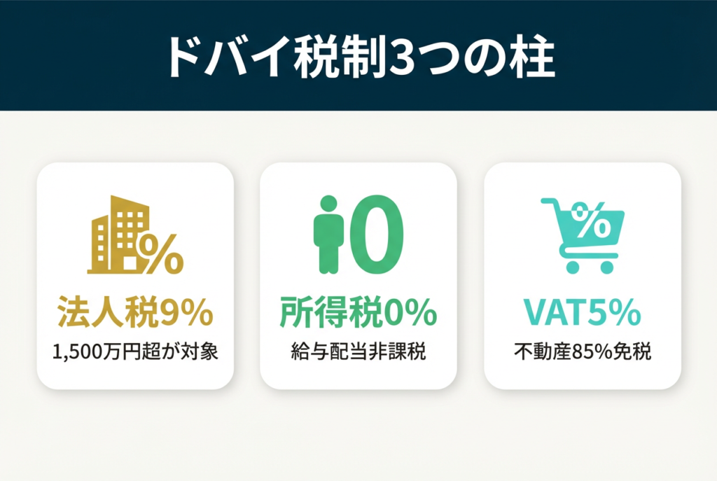 | 法人税 | 0% / 9% | 37.5万AED(約1,500万円)以下:0% 超過分:9% |