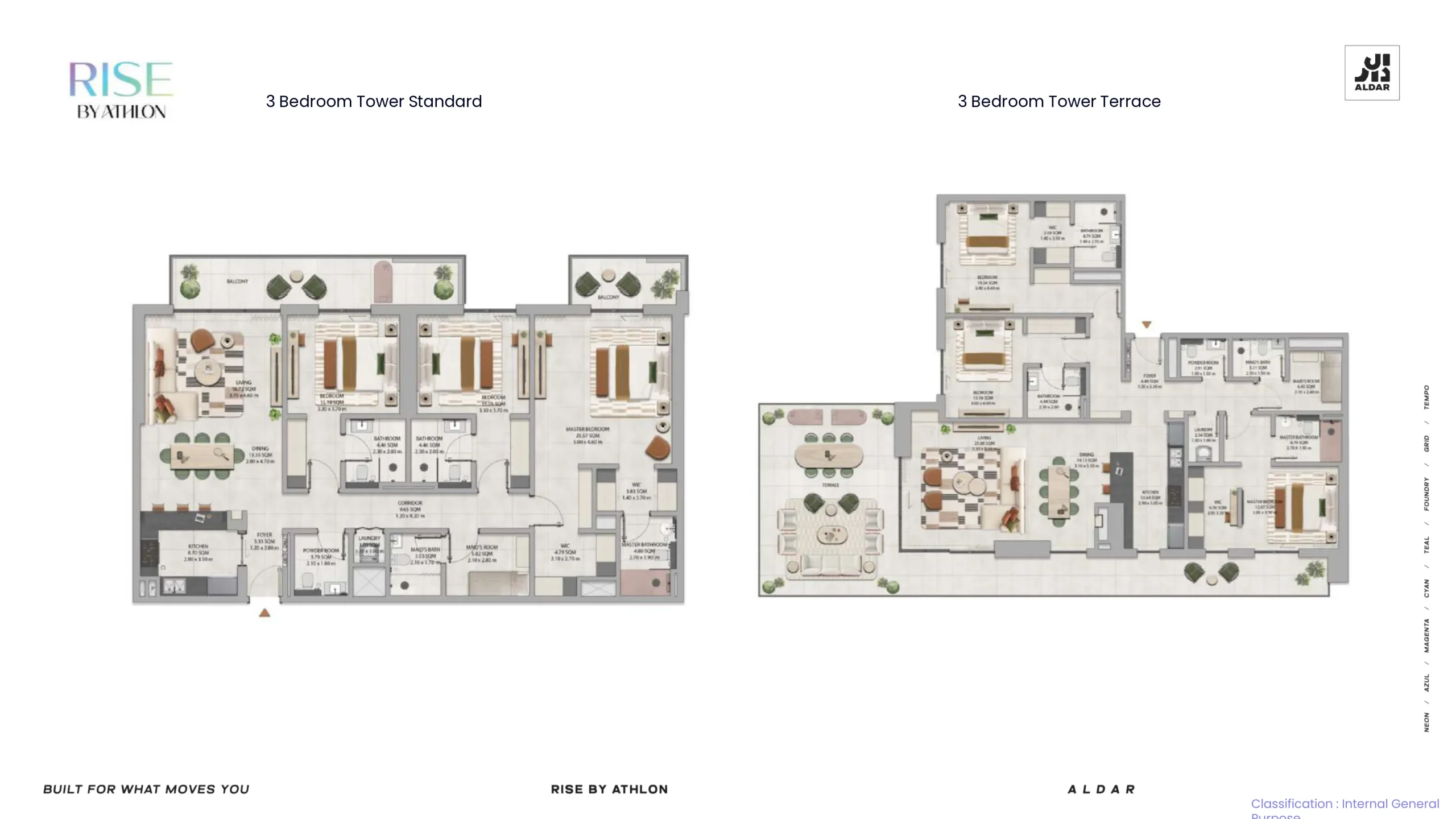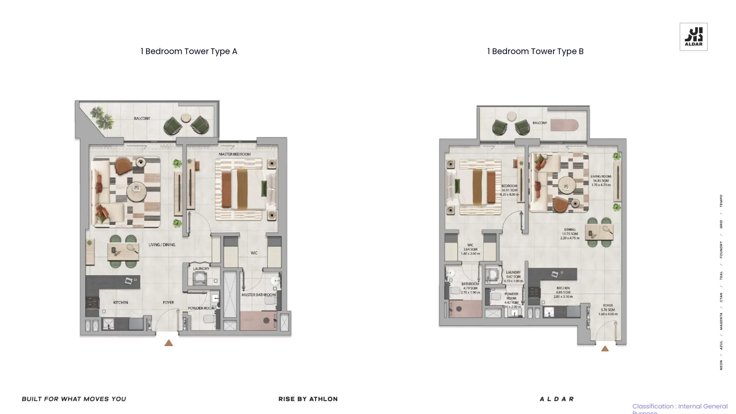 本プロジェクトは、Aldar Properties PJSC(アルダー) によって開発され、同社が培ってきた高品質な建築とコミュニティ形成のノウハウが随所に活かされています。居住用アパートメントは、1〜3ベッドルームを中心に多彩な間取りが用意されており、単身者からファミリー層まで幅広いニーズに対応可能です。また、メイドルーム付きのプレミアムプランも揃っており、ゆとりある生活空間を提供します。