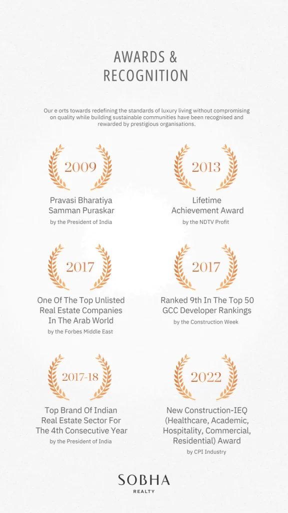 業界での評価と受賞歴も輝かしく、Sobhaは「世界中で最も信頼され評判が高い不動産会社になる」という企業理念のもと品質第一のものづくりを追求してきました。建築設計・施工において国際規格ISO 9001やISO 14001、OHSAS 18001を取得し、安全性・環境配慮・労働安全の面で最高水準を満たす努力が実っています。その結果、「Real Estate Developer of the Year(年間最優秀不動産開発会社)」を受賞し、他にも世界的な機関から数々の賞に輝きました。同社がインドで株式上場(IPO)した際には、新規株式の応募倍率が126倍にも達したとの記録もあり、投資家からの厚い信頼と期待を物語っています。