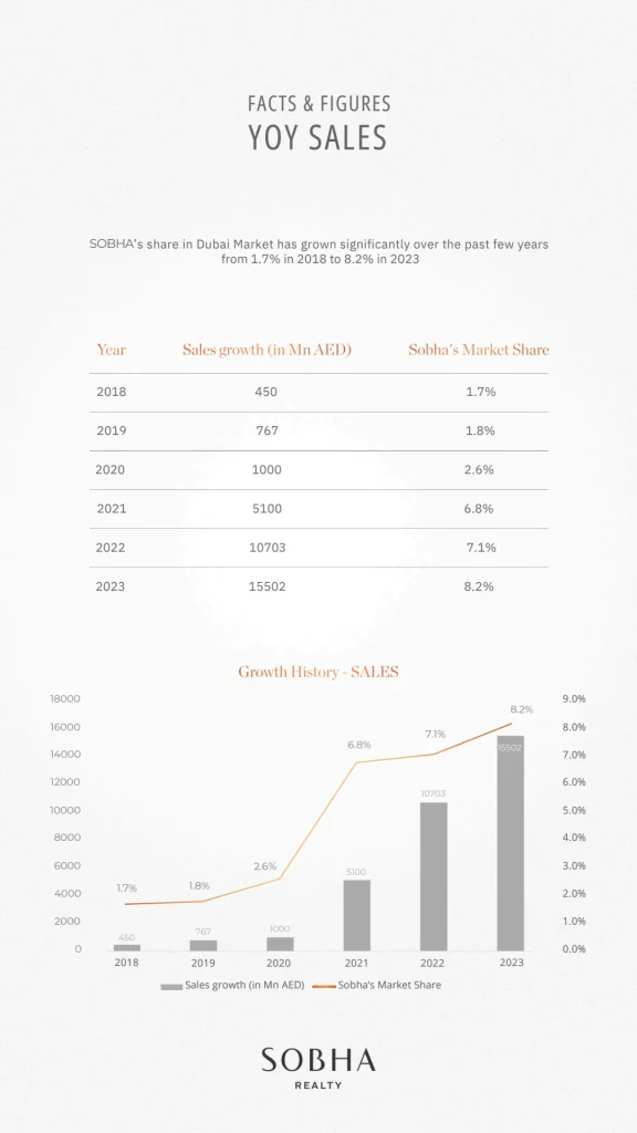 Sobha Realtyはドバイ不動産市場でのシェアを大きく拡大しており、2018年の 1.7% から2023年には 8.2% まで成長しました。売上高も右肩上がりで急成長しています。