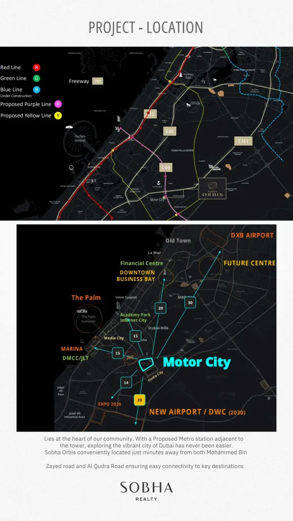 Sobha Centralは ドバイの中心部に位置し、主要幹線道路や公共交通機関へのアクセスに優れたロケーション にあります。都心の利便性を享受しながら、住宅地としての落ち着きも兼ね備えています。