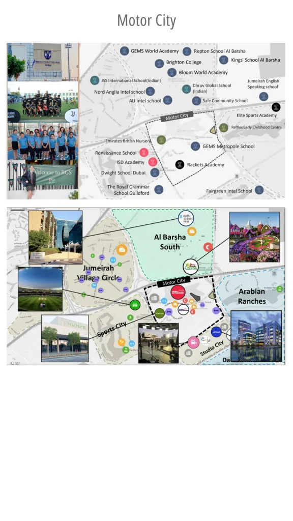 モーターシティ周辺には多くのインターナショナルスクールや商業施設、スポーツ施設が揃っており、ファミリー層から単身のオフィスワーカーまで幅広く支持されるエリアです。