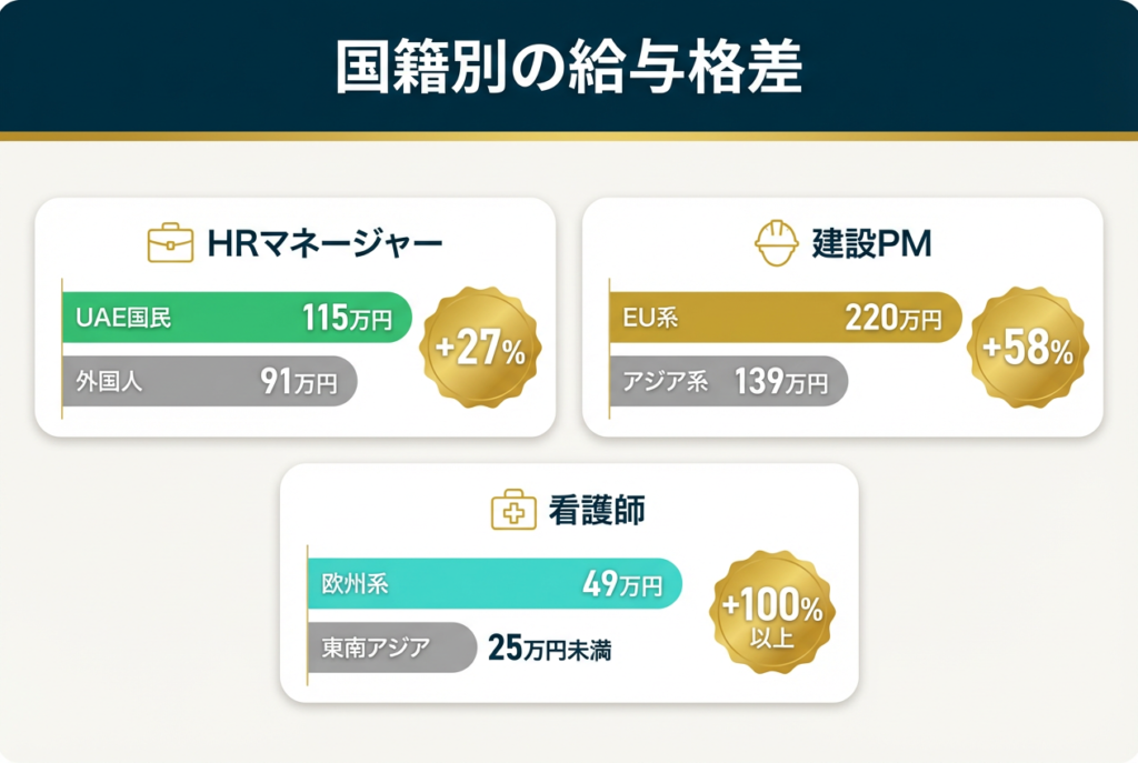 出典:LinkedIn: 「Equal Pay for UAE Nationals and Expats – Myth or Reality? (April 2025)」、Gulf Migration Research Center: 「UAE: Nationality-based Salary Comparison (2017)」、Journey2MyLife: 「Expat vs. Local Pay in the UAE (June 2025)」