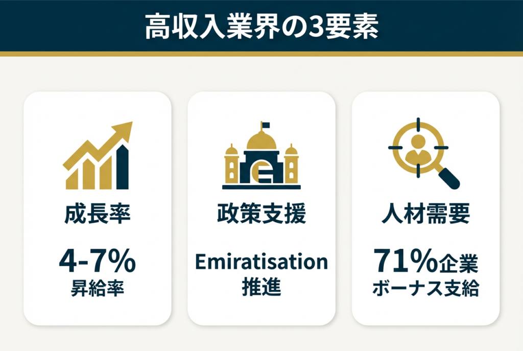 これらの業界が高収入を生む背景には、ドバイ政府の経済多角化戦略があります。石油依存からの脱却を目指し、知識集約型産業やイノベーション産業への投資を強化しているため、該当分野の専門人材への需要が高まっています。