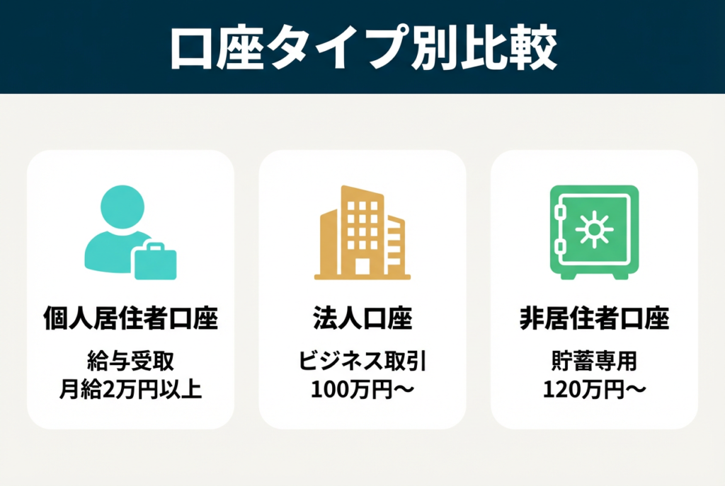 どちらの口座タイプを選ぶかは、居住ステータスと資金の使用目的により判断する必要があります。