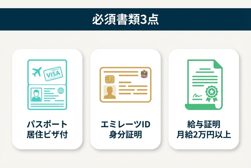 UAE居住者が個人口座を開設する場合、有効な居住ビザ付きパスポート、エミレーツID、給与証明書の3点が必須書類です(*1)。