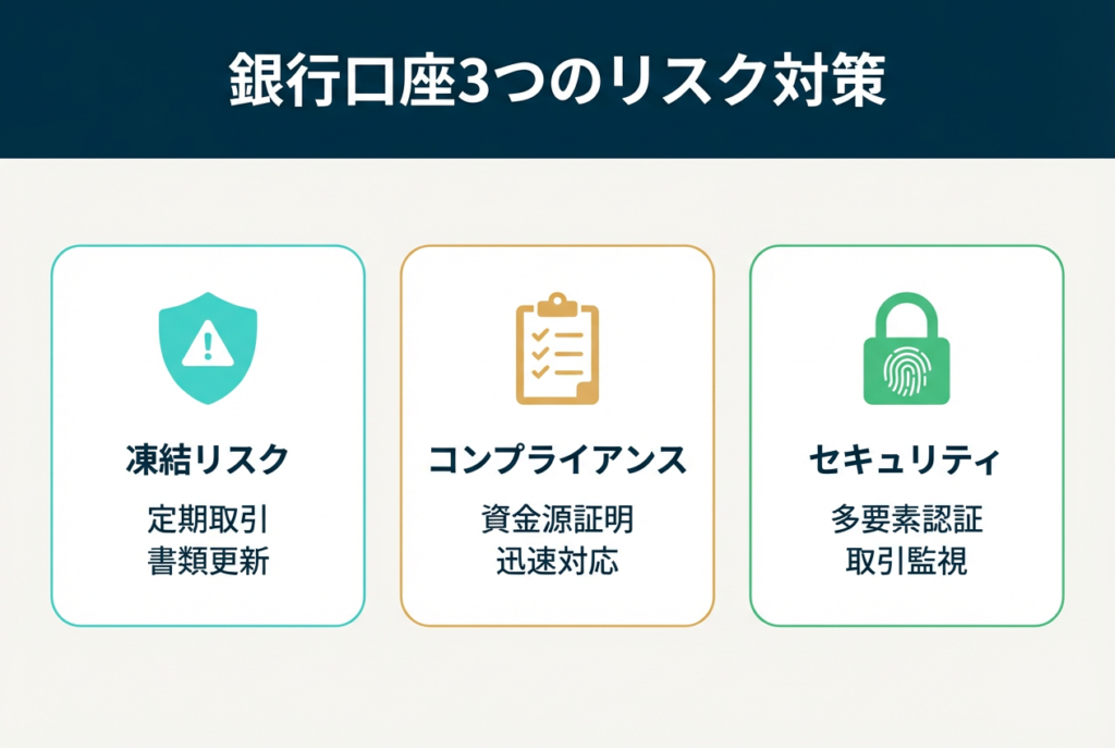 口座凍結の最も一般的な原因は、AMLコンプライアンス違反または書類更新の不備です。特に不明瞭な大口送金、頻繁な国際送金、事業内容と一致しない取引パターンは、銀行の監視システムに警告を発します。