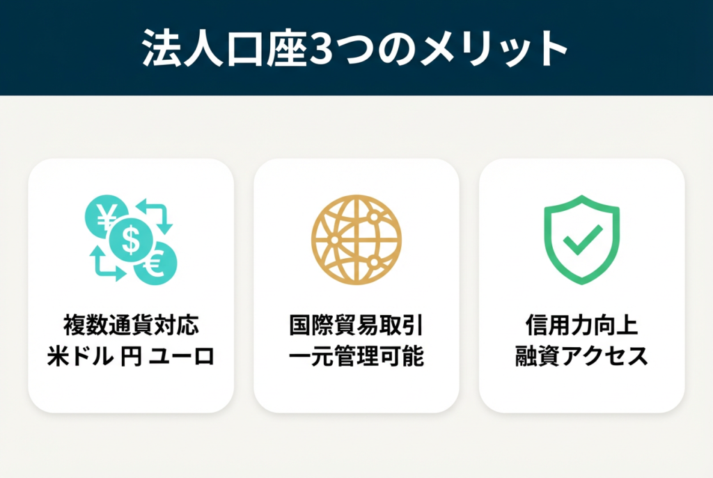 法人口座の最大のメリットは、国際貿易取引と複数通貨での運用が可能になる点です。