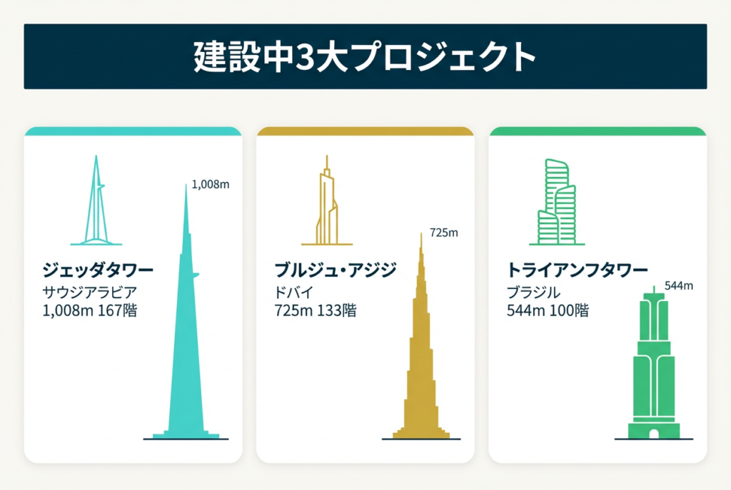 2025年時点で建設が進む最大のプロジェクトは、サウジアラビアのジェッダタワーで、計画高さは1,008メートルです(*6)。2024年末に工事が再開され、現在約3分の1が完成しています。