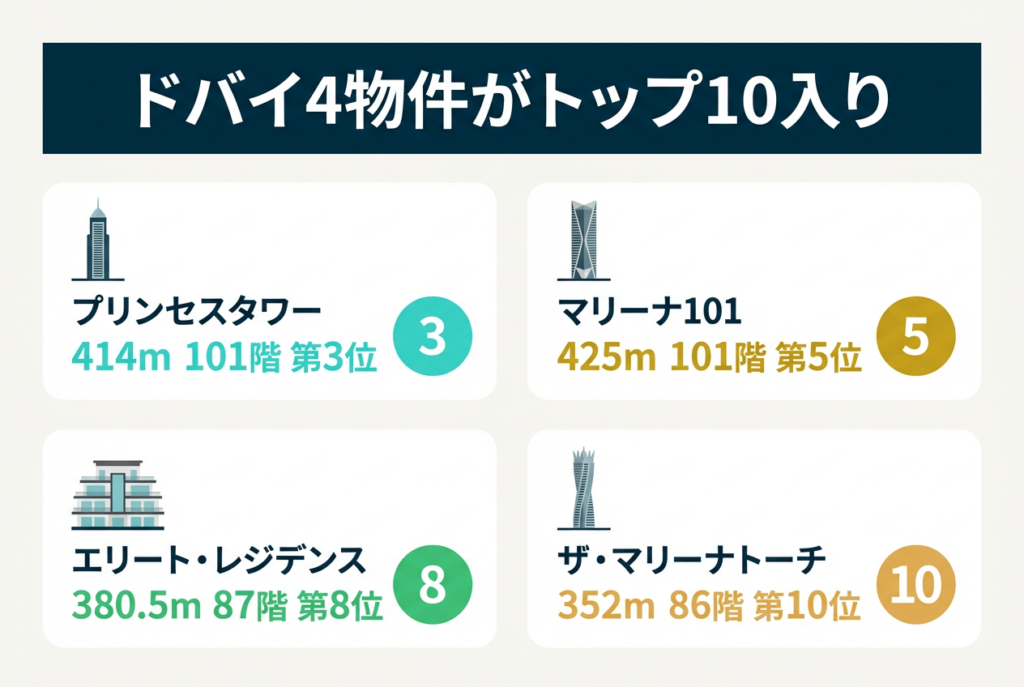 第3位はドバイのプリンセスタワーで、高さ414メートル・101階建てです。かつては世界一高い居住用タワーの記録を保持していた建物で、現在もドバイを代表するランドマークの一つとなっています。