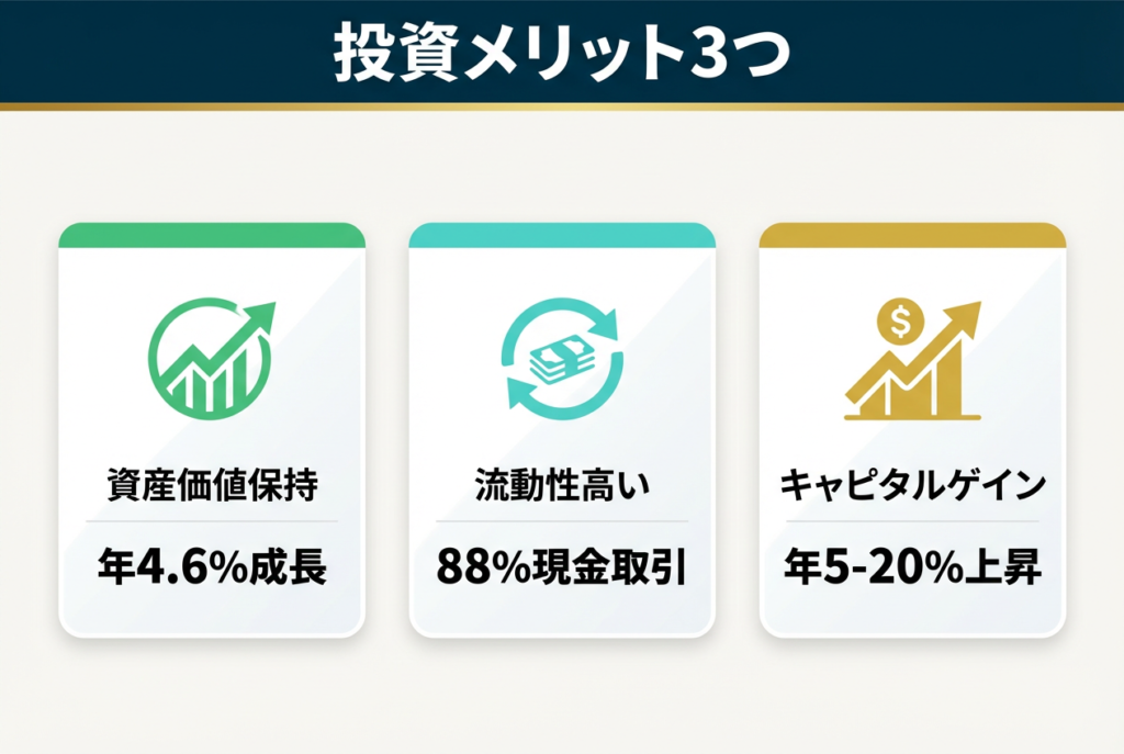 メリットとして、高級物件は一般物件より速いペースで価値が上昇し、経済低迷期でも価値を保持する傾向があります。東京の利回りは3.5%から4%で、北京・上海の2%未満を上回ります。