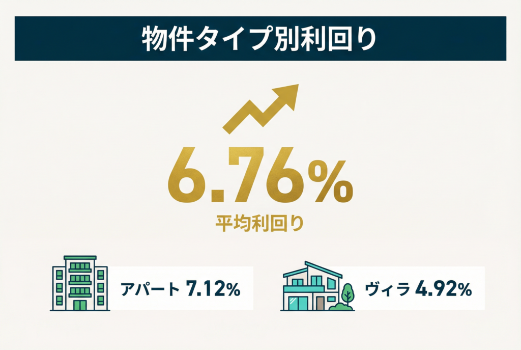 2025年9月時点で市場全体の平均利回りは6.76%を記録しており、アパートは7.12%、ヴィラは4.92%という水準です(*2)。これは東京やロンドン、ニューヨークなどの主要都市と比較して2倍以上の利回りとなっています。