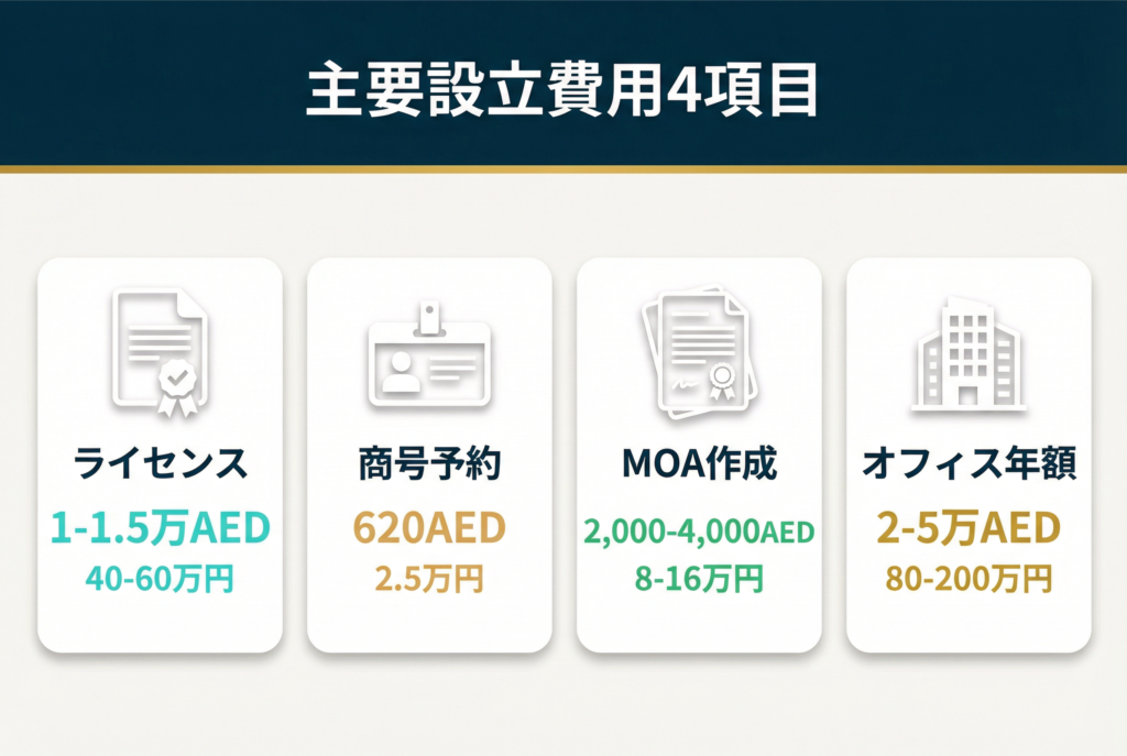 標準的な設立費用は1.5万〜5万AED(約60万〜200万円)ですが、事業活動により異なります。一般貿易は1.5万AED、不動産は5,000〜2.5万AED、建設請負は1万AEDが目安です。隠れた費用として、外国語商号費用1,000〜3,000AED、MOA公証費用300〜1.5万AED、Ejari登録120AED、専門コンサルタント費用などがあります。