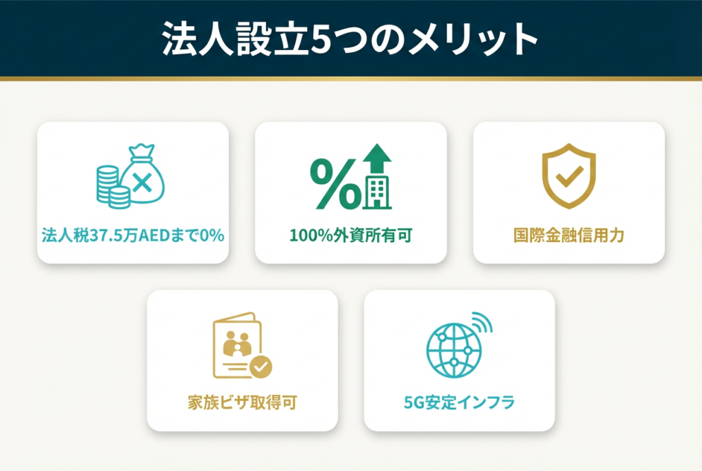 非適格主体の場合でも、37.5万AED(約1,500万円)までは0%、超過分のみ9%の税率が適用されます。他の先進国と比較して税負担が大幅に低く、事業利益の最大化に有利な環境が整っています。