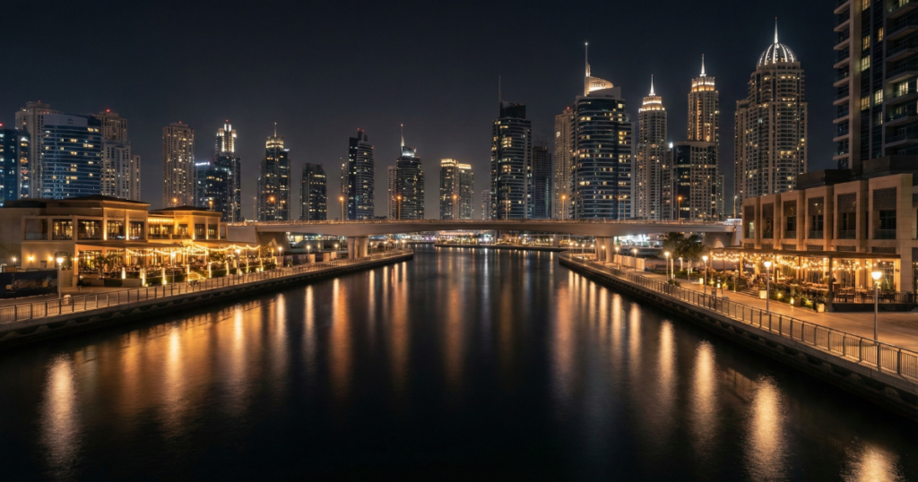 水辺から見上げる高層ビル群と、橋から眺めるパノラマビューは、ドバイ観光の新たな魅力として人気を集めています。日没後のゴールデンアワーには、運河に映る夕焼けとビルのシルエットが絶景を生み出します。
