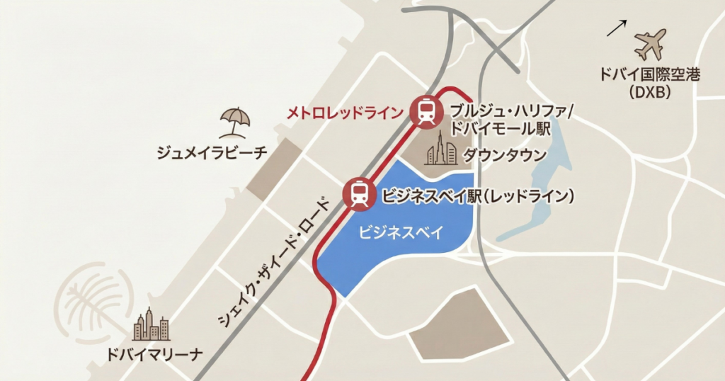 ビジネスベイ駅はドバイメトロのレッドラインに属し、ブルジュ・ハリファ/ドバイモール駅の隣駅に位置します(*18)。駅間の所要時間は約3分と非常に短く、ドバイ中心部へのアクセスが極めて容易です。駅はシェイク・ザイード・ロード沿いにあり、主要オフィスビルへの接続が良好です。