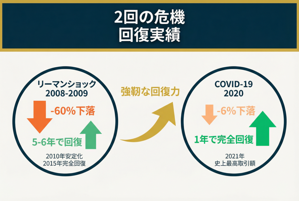 リーマンショック時の回復に5年以上を要したのに対し、COVID-19危機からはわずか1年で完全回復を達成しました。