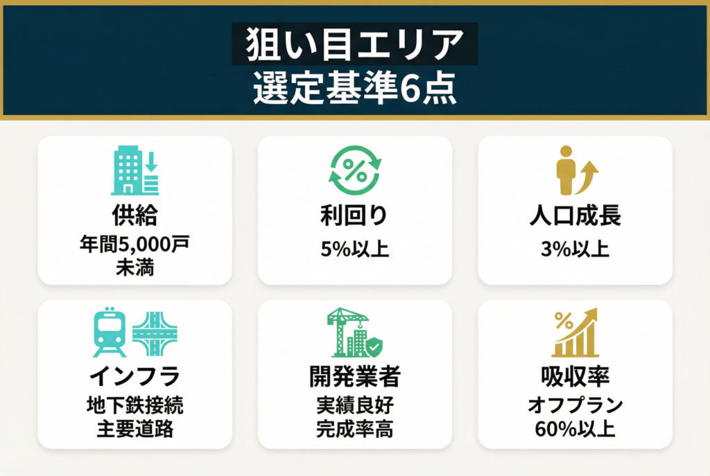 第一に、年間供給が5,000戸未満のエリアを選ぶことで供給過剰リスクを回避できます。第二に、利回り5%以上を確保できる物件を優先し、賃貸需要の強さを確認します。第三に、人口成長率3%以上を維持しているエリアは実需が継続的に増加します。