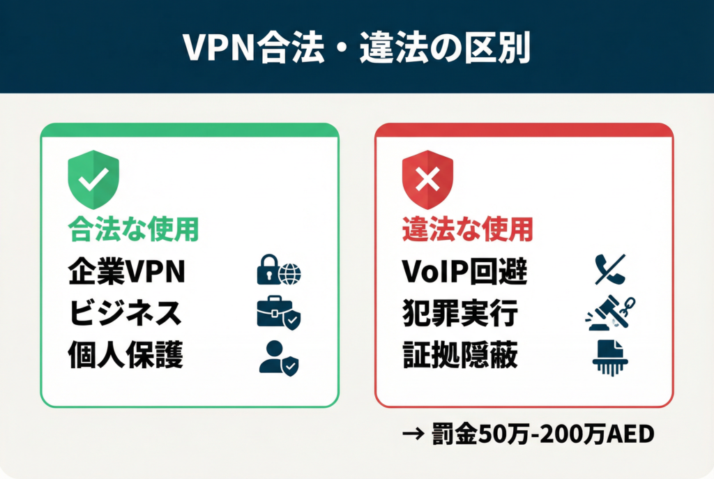 違法とされるのは、VPNを使用して犯罪を実行すること、詐欺目的でブロックされたVoIPサービスにアクセスすること、麻薬密売・人身売買・ヘイトスピーチなどの重大犯罪を助長することです。