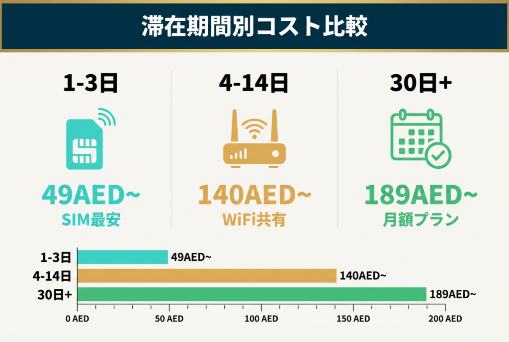 滞在期間別の最適な通信環境とコスト目安を比較すると以下の通りです。