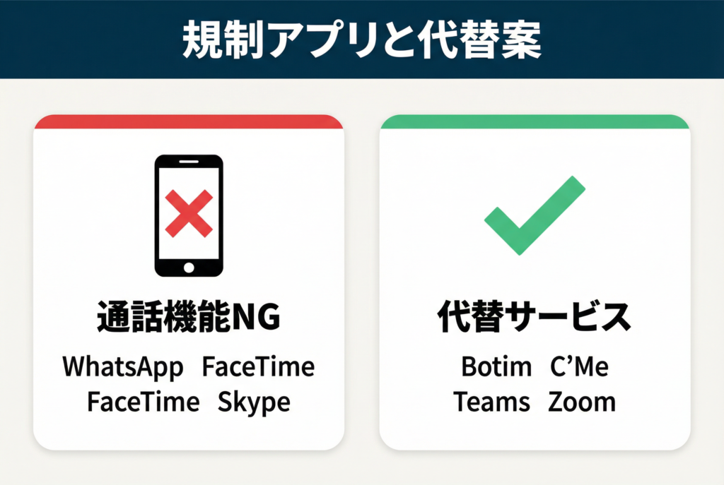 ただし、WhatsAppやLINEの音声・ビデオ通話機能は規制により接続できません。代替手段として、ライセンスを持つBotim、C’Me、Microsoft Teams、Zoomを使用すれば、音声・ビデオ通話が可能です。