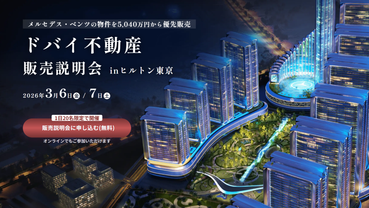 本説明会では、世界初「メルセデス・ベンツ ブランドシティ」の全貌に加え、ドバイ不動産市場の最新動向と投資戦略を解説いたします。確保された200戸限定価格の物件情報をご案内するとともに、エリア選定・物件選定の実践的なポイントまで分かりやすくご説明します。