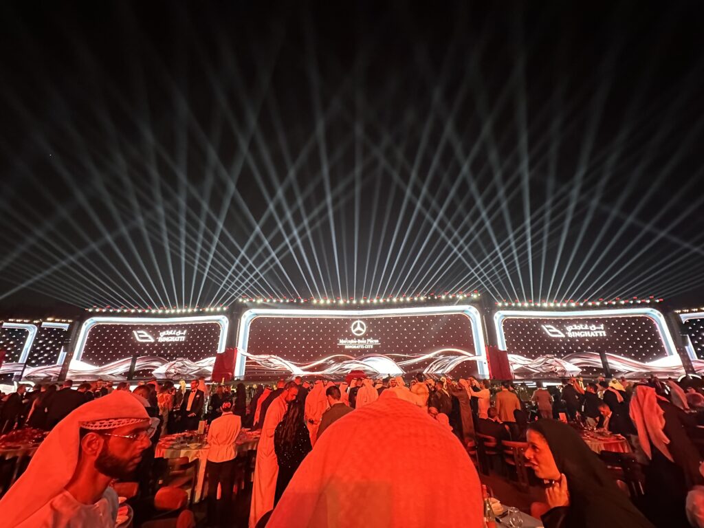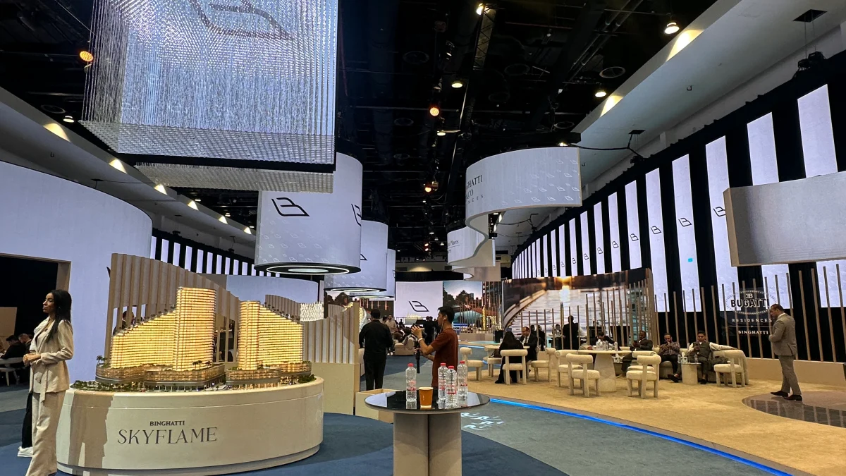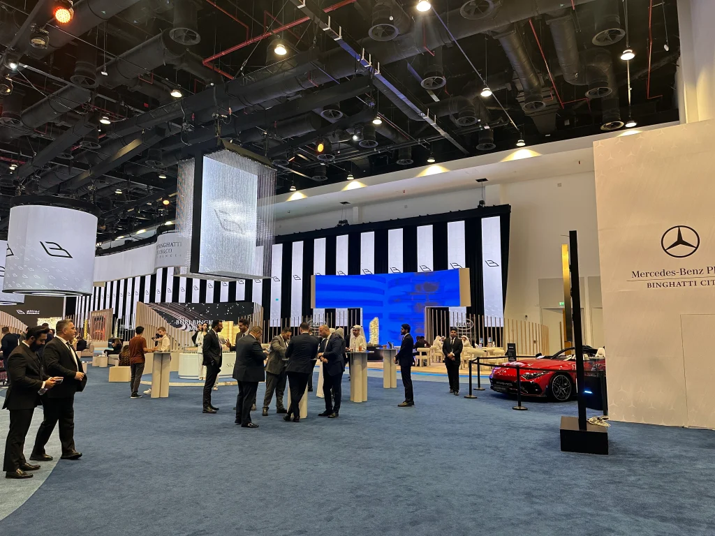 このイベントオフィスは、ラマダン期間に合わせた特別ディナーの開催や、最新プロジェクトの模型展示、そしてメルセデス・ベンツとのコラボレーション物件の紹介など、単なる「販売窓口」を大きく超えた体験型の空間として設計されていました。高級車の展示も行われ、ビンガッティが体現するドバイのラグジュアリー不動産の世界観を直接肌で感じられる場として、多くの投資家・来場者を集めました。